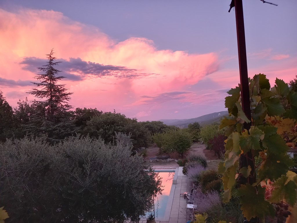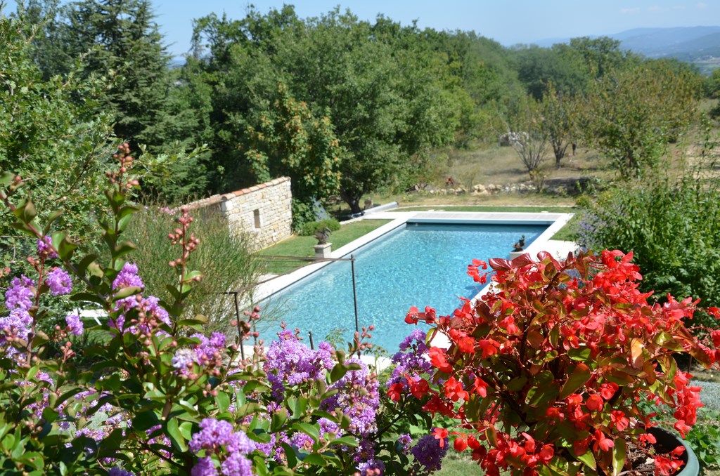 L'espace paysager de la piscine est agrémenté de fleurs, gazon. Des transats et chaises longues sont à disposition. Vue sur le LUBERON tout proche et sur la vallée du CALAVON.
