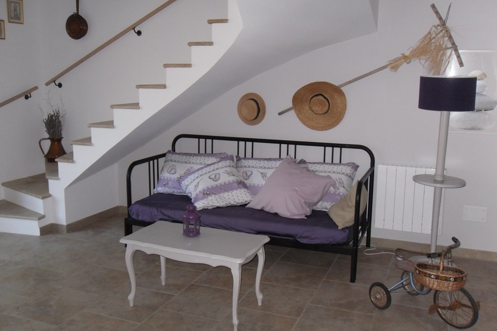 * En rez de jardin : Le séjour est une vaste pièce, très claire au décor provençal - esprit lavandes. L'espace cuisine est en harmonie avec l'ensemble. WC. Escalier en pierres de taille.