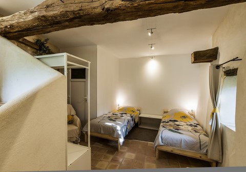 Au rez de chaussée, le séjour et le coin cuisine donnent sur la terrasse. Un escalier descend dans une chambre de 2 lits simples située en rez de jardin. Cette pièce très fraîche en été, donne sous la terrasse. La seconde chambre avec 1 lit double et la salle d'eau sont à l'étage.