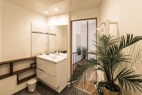L'entrée se situe dans une petite rue calme, les pièces à vivre s'ouvrent côté nature sur le quartier des jardins, il n'y a pas de vis à vis.