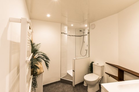 Salle d'eau WC : douche de 140 cm par 90 cm, lavabo simple vasque, WC.