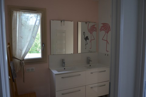 Salle d'eau : grande douche de 160cm par 90 cm, lavabo double