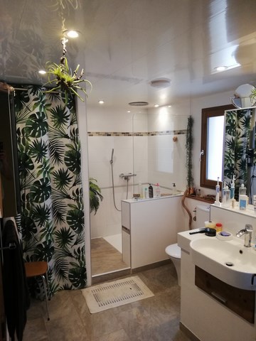 Salle d'eau WC : douche de 140 cm par 90 cm, lavabo simple vasque, WC, lave linge.
