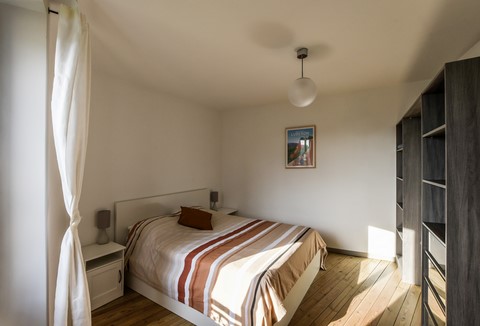 Au rez de chaussée, le séjour et le coin cuisine donnent sur la terrasse. Un escalier descend dans une chambre de 2 lits simples située en rez de jardin. Cette pièce très fraîche en été, donne sous la terrasse. La seconde chambre avec 1 lit double et la salle d'eau sont à l'étage.